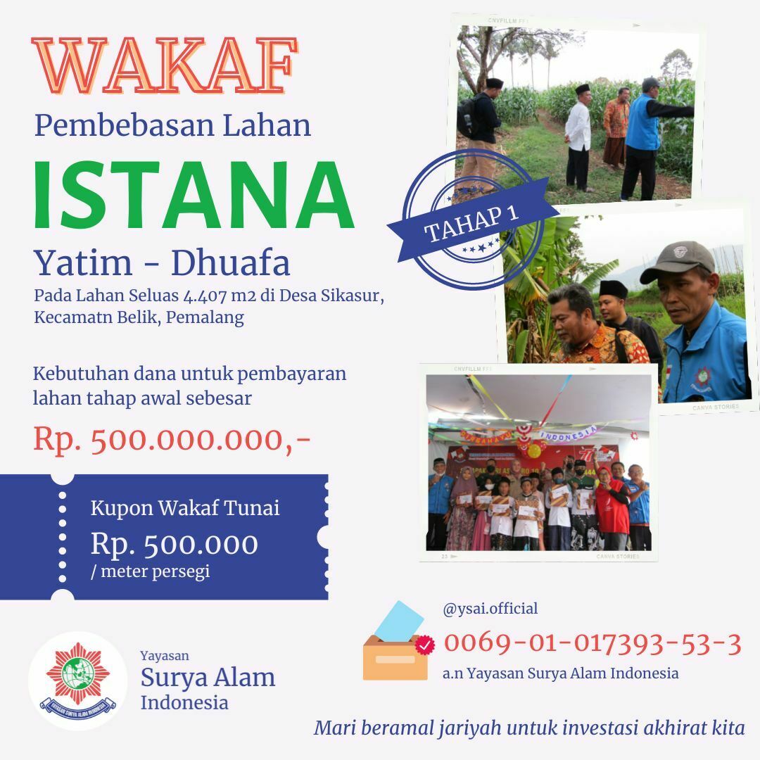 Kami Yayasan Surya Alam Indonesia sebagai lembaga yang bergerak di bidang pendidikan, sosial dan keagamaan pun mempunyai program wakaf uang untuk pembebasan lahan guna pembangunan Istana Yatim-Dhuafa YSAI. Pada lahan seluas 4.407 m2 yang berlokasi di Desa Sikasur, Kecamatan Belik, Kabupaten Pemalang ini akan dibangun komplek pendidikan dan lahan produktif bagi anak-anak Yatim-Dhuafa binaan Yayasan.